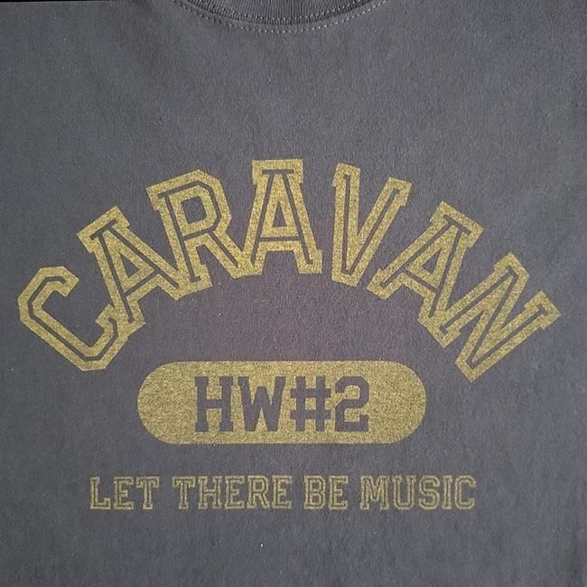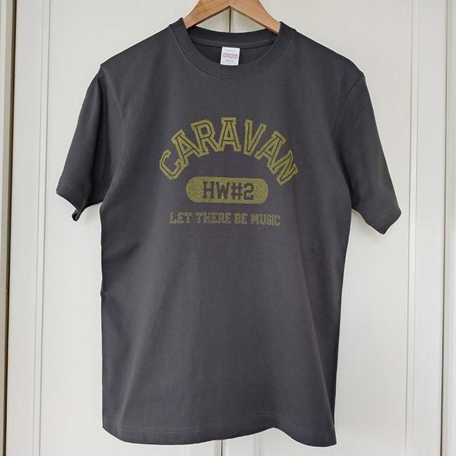 6.2ozの厚手で上質な生地を使ってしっかり縫製され、型くずれしにくく、首回りは特に頑丈。 羽立ちを抑える「コーマ糸」を採用し、洗濯縮みを軽減するために縫製前に「防縮加工」(水洗い・タンブル乾燥)を施したハイグレードモデルのTシャツ。フロントにはCaravanデザイン カレッジ風ロゴをプリント。ヴィンテージ感を出すために手刷りで1枚1枚擦れさせてます。